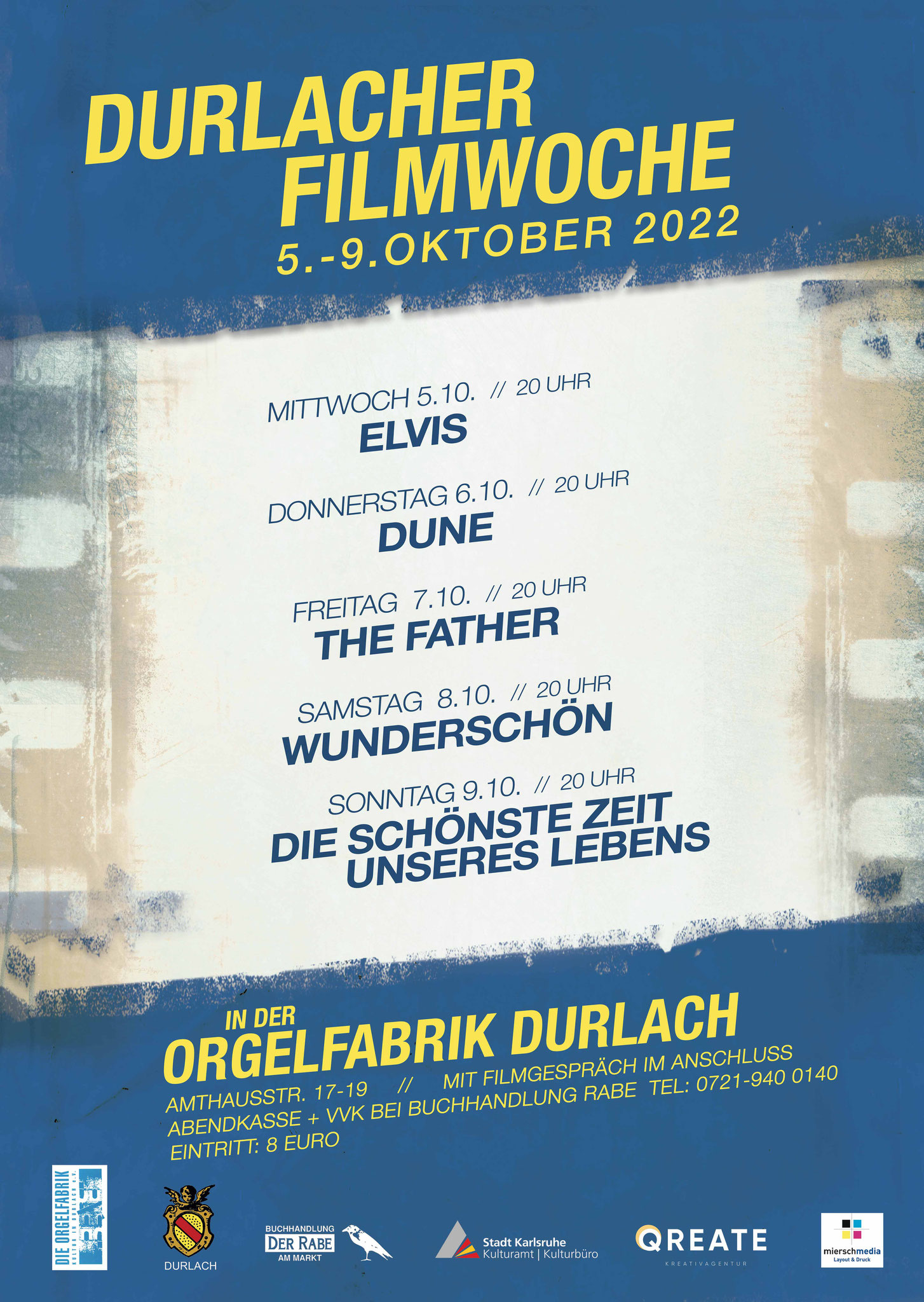 Filmbeginn ist jeweils um 20 Uhr, der Einlass 30 Minuten zuvor. Der in Karlsruhe bestens bekannte Organisator und Filmemacher Serdar Dogan sowie sein Team von der Qreate Kreativagentur und dem Arbeitskreis des Orgelfabrik-Vereins stehen an allen Abenden nach der Aufführung zu einem Filmgespräch zur Verfügung. Der Verein Die Orgelfabrik – Kultur in Durlach e. V., das Stadtamt Durlach, das Kulturamt der Stadt Karlsruhe laden zum Kinobesuch ein.